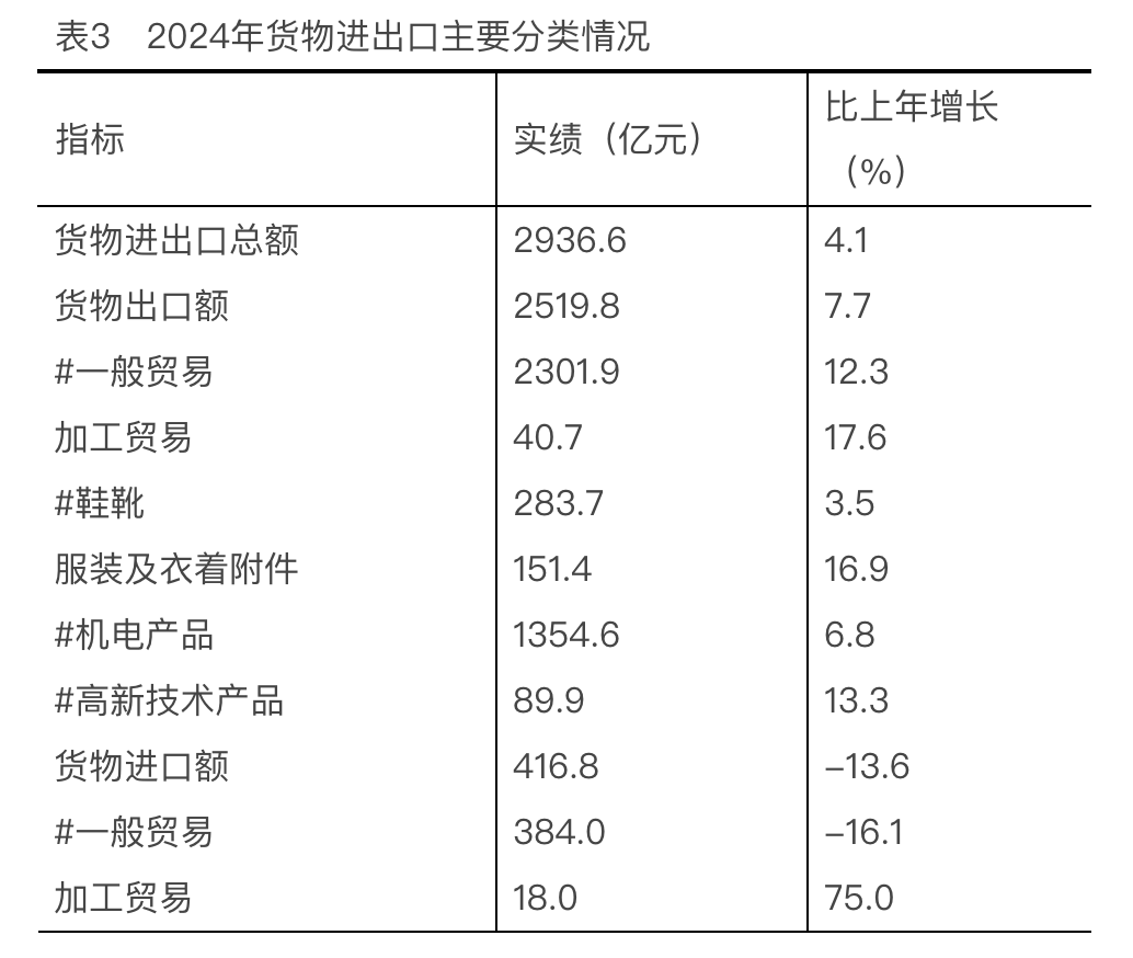 2024年,温州全年貨物進出口總額2936.6億元,比上年增長4.1%,其中出口2519.8億元,主要涉及鞋、服、機電產品等領域。貿易空間持續拓展,對共建“一帶一路”國家、東盟、拉丁美洲出口額分別比上年增長6.8%、16.3%、12.6%。