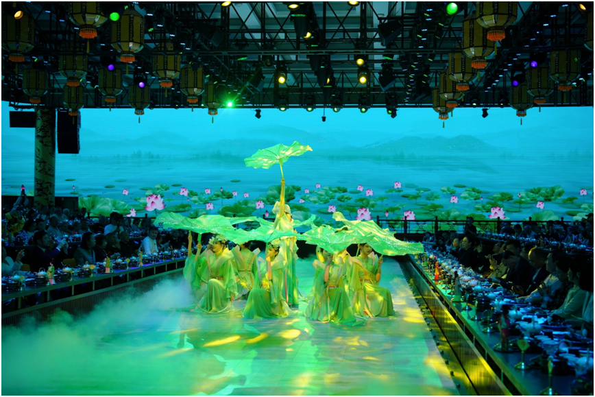 本次演出的總導演陳維亞介紹:“這次全新改版的《中華一品宴》除了更加深度地挖掘中華飲食文化“軟實力”的表達外,在舞台科技硬件上也下足了功夫。整個演出空間由450平方米的360度的高清LED環屏構建,各種最新款燈光600餘盞,5·1環繞音響50只,各類服裝350餘件,道具130種,全場演職人員超150人。