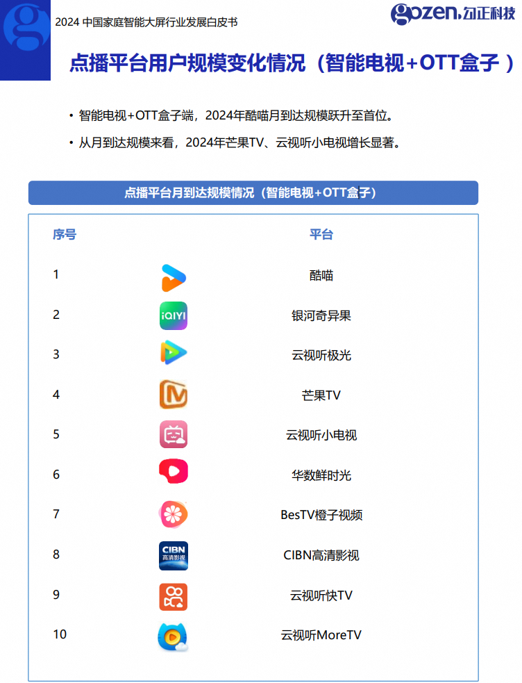 2024年,我國智能電視家庭用户超過3.36億户,滲透率近7成。在OTT+電視盒子端,酷喵月活家庭用户達1.35億,日活家庭用户0.51億,均領跑行業。 銀河奇異果和雲視聽極光分列第二、第三位。