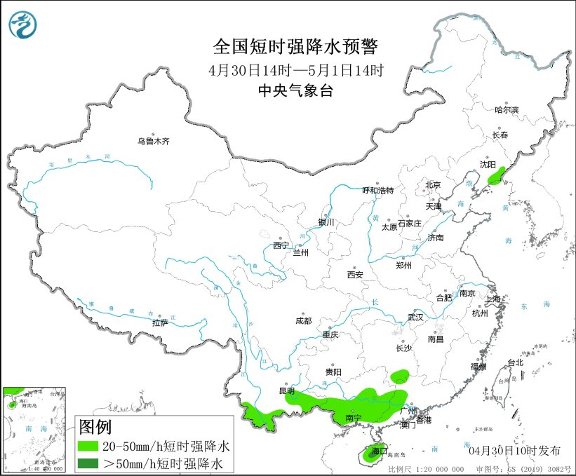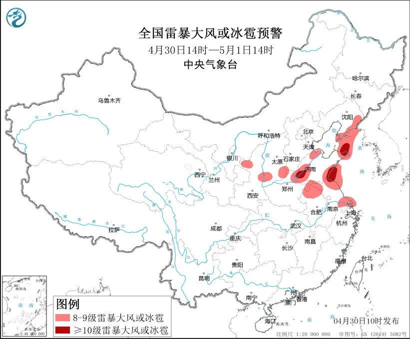 預計4月30日14時至5月1日14時,東北地區東南部、華北南部、黃淮中東部、江淮東部等地及渤海東部、黃海等近海區域的部分地區將有8級以上雷暴大風或冰雹天氣,其中,山東東部和南部、江蘇東北部等地的局地將有10級以上雷暴大風,最大風力可達11級;東北地區東南部、西南地區南部、華南中西部等地的部分地區將有小時雨量大於20毫米的短時強降水天氣,其中,海南島中部等地的局地小時雨量大於50毫米。