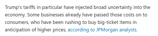 商界領袖們迫切希望美國的政策能有幾周的穩定,美國農户們發現自己的聯邦食品補貼合同已經終止,全美各地的非營利組織都在裁員,因為白宮正在削減開支。尤其是特朗普政府的關税政策給經濟帶來了廣泛的不確定性。摩根大通分析師表示,一些企業已經將這些成本轉嫁給了消費者,消費者因預期價格上漲而搶購大件商品。