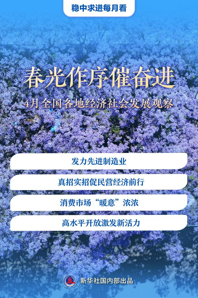 人間四月,春和景明。先進製造業發展步伐加快、多措並舉促民營經濟高質量發展、春日消費持續升温、高水平開放激發新的經濟活力……今年4月以來,我國經濟呈現向好態勢,春光作序,高質量發展紮實推進。
