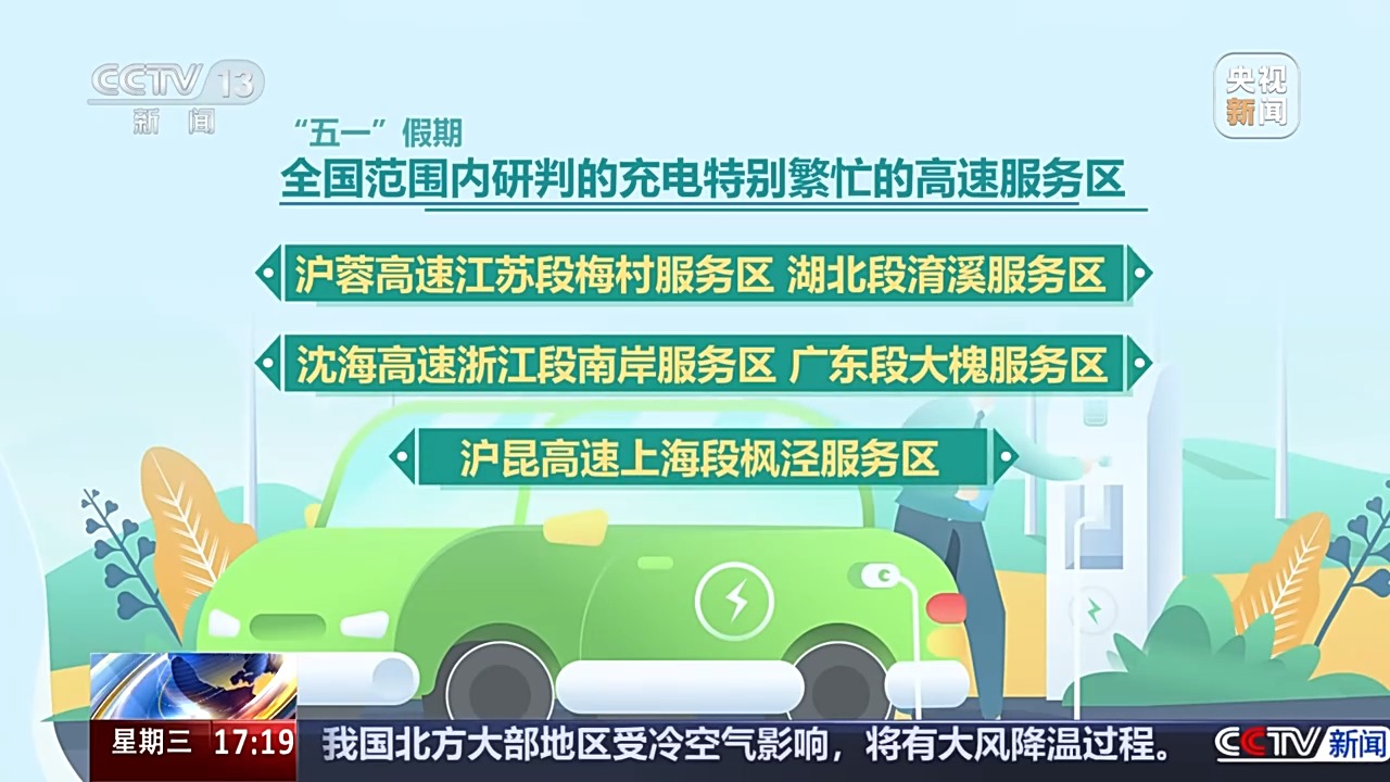 根據預測,“五一”假期,*全國範圍內研判的充電特別繁忙的高速服務區分別為:*濟廣高速江西段南城服務區;瀋海高速福建段長樂服務區、福安服務區;滬武高速江蘇段茅山服務區;滬蓉高速江蘇段梅村服務區;湖北段淯溪服務區;濟廣高速江西段南城服務區;瀋海高速浙江段南岸服務區、廣東段大槐服務區;滬昆高速上海段楓涇服務區。