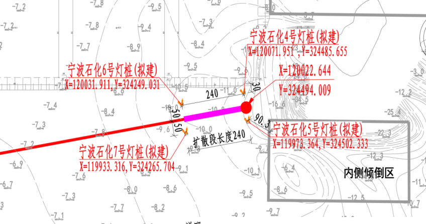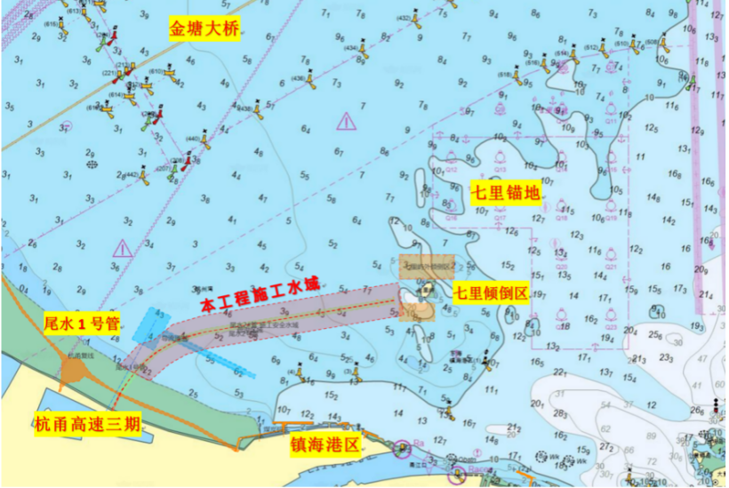 本工程位置在鎮海區域,附近的主要港口功能區和港口設施有鎮海港區口外泊位,七里錨地、七里嶼內/外側傾倒區、金塘大橋,已建尾水1號管等。