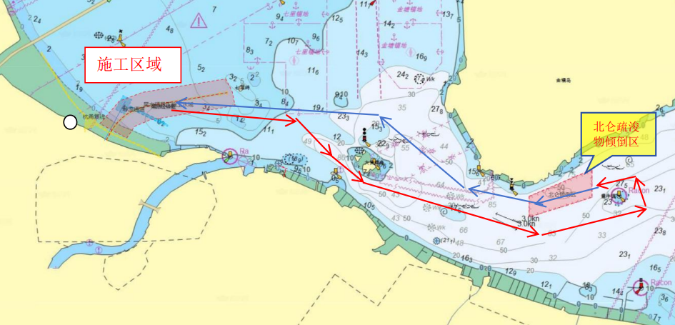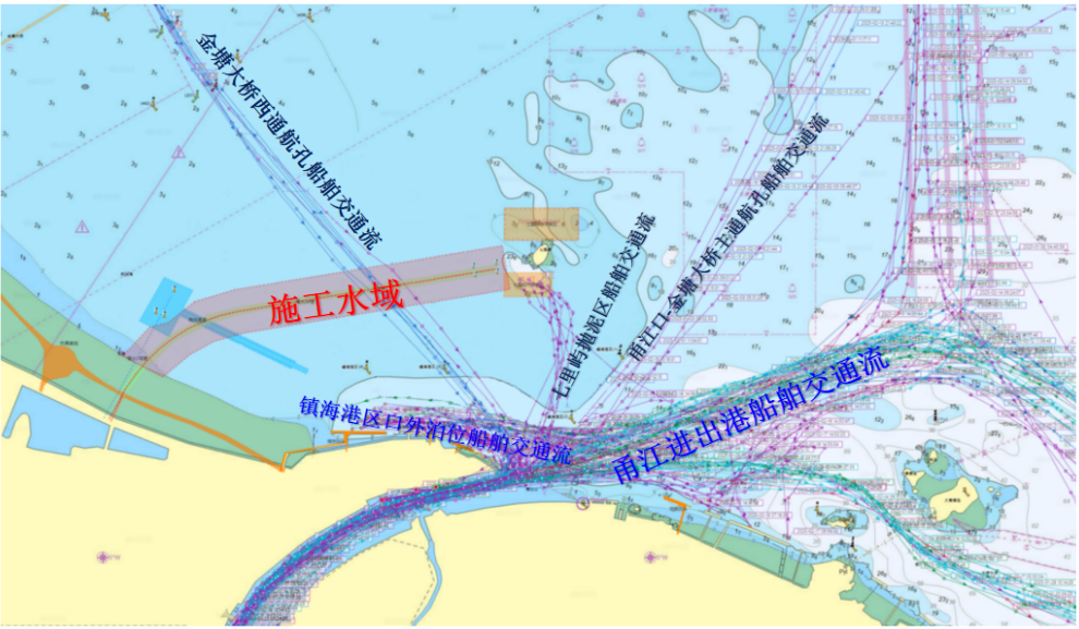 工程位置附近通航環境較為複雜。金塘大橋西通航孔船舶交通流經過施工水域,七里嶼內、外側拋泥區船舶交通流距離施工水域較近,工程拋泥船需要頻繁穿越甬江口水域,可能會和甬江口進出口船舶形成交匯局面。拋泥船航法如圖。
