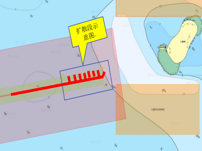 4、七里嶼內、外側傾倒區若有傾倒作業,提前與施工單位聯繫,傾倒船舶應從七里嶼東側往返,避免進入施工水域。