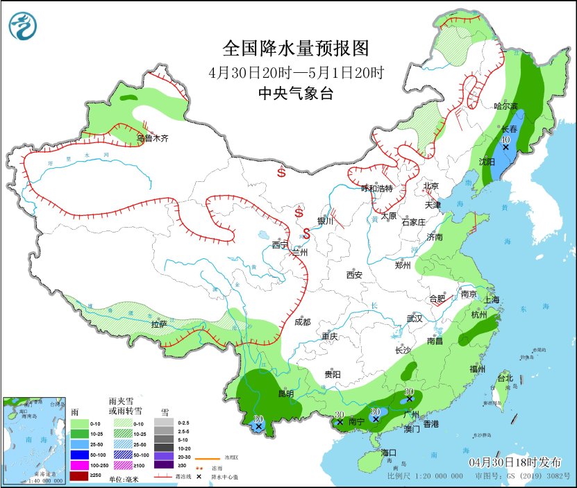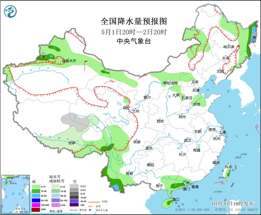 *4月30日20時至5月1日20時,*內蒙古東北部和中部、西藏東北部和南部等地部分地區有雨夾雪。東北地區大部、新疆北部、西藏東部、黃淮東部、江淮東部、江南大部、西南地區南部、華南、台灣島、海南島等地部分地區有小到中雨,其中,東北地區東南部、雲南西南部、廣西東南部等地部分地區有大雨(25~40毫米)。新疆北部、內蒙古西部和東部、甘肅河西、寧夏、陝西北部、山西、北京西部山區、河北北部、天津、遼寧西部和遼東半島以及河南東部、山東中東部、安徽北部、江蘇北部和南部、上海、浙江北部等地部分地區有5~6級、陣風7~9級的大風,局地陣風可達10~11級;渤海、渤海海峽、黃海大部海域將有7~8級、陣風9~10級的大風(見圖2)。