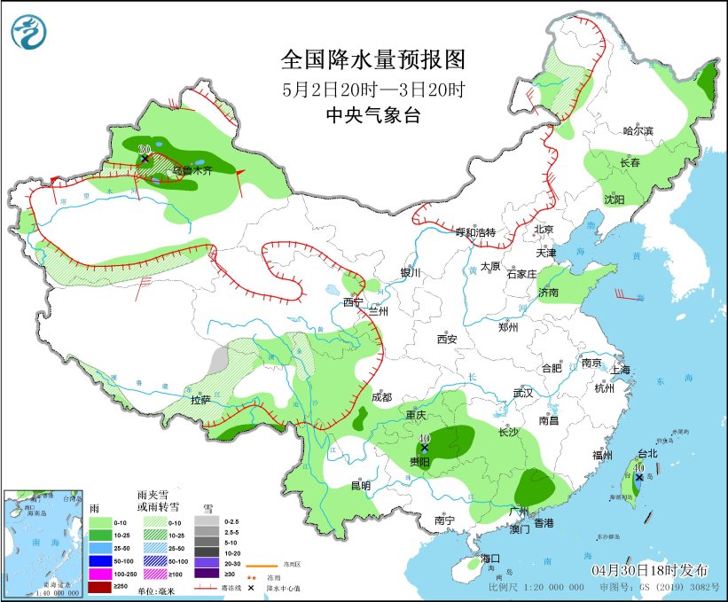 *5月2日20時至3日20時,*新疆沿天山地區、內蒙古東北部、西藏東北部和南部、青海南部、川西高原北部等地部分地區有雨夾雪。新疆北部、內蒙古東北部、東北地區中東部、西藏東部、青海南部、四川西部和南部、雲南西部和南部、貴州、湖南中南部、華南中北部、台灣島等地部分地區有小到中雨,其中,新疆沿天山地區和伊犁河谷、貴州中部、台灣島東部等地局地有大雨(25~40毫米)。新疆、內蒙古東部、西藏北部、青海西部等地部分地區有4~6級風,其中,新疆南疆西部山區和東部等地部分地區有7~8級風(見圖4)。