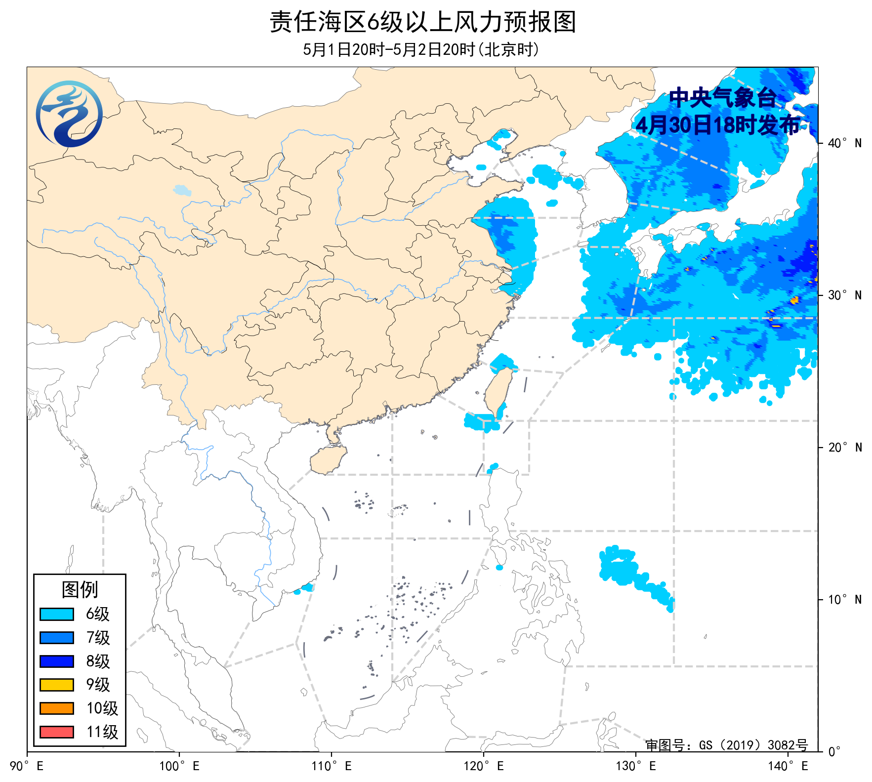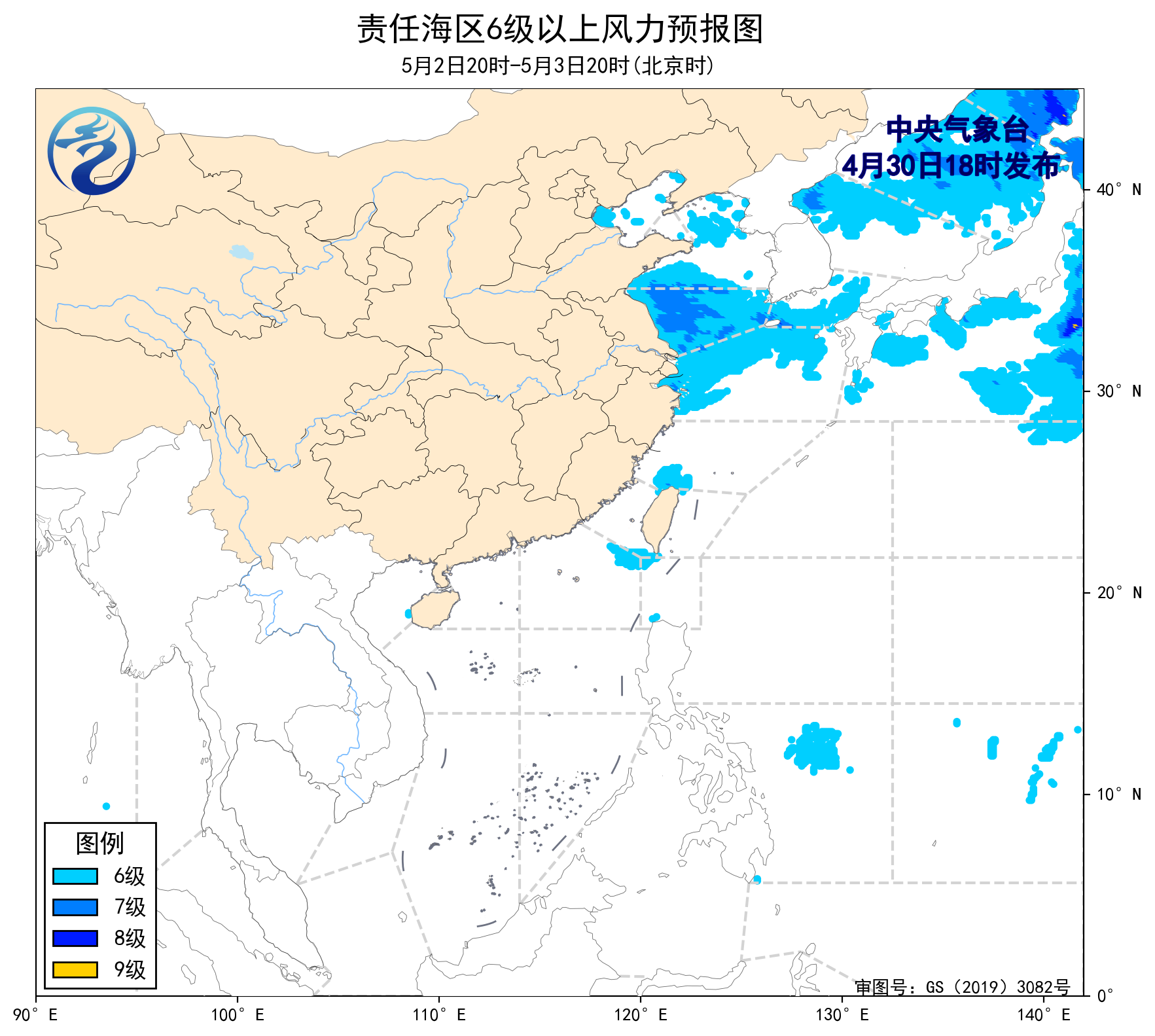 5月3日夜間至4日白天,渤海、渤海海峽、黃海大部海域、東海大部海域、台灣海峽將有5~7級、陣風8級的風;4日夜間至6日白天,渤海、渤海海峽、黃海大部海域、東海大部海域、將有5~7級、陣風8級的旋轉風。
