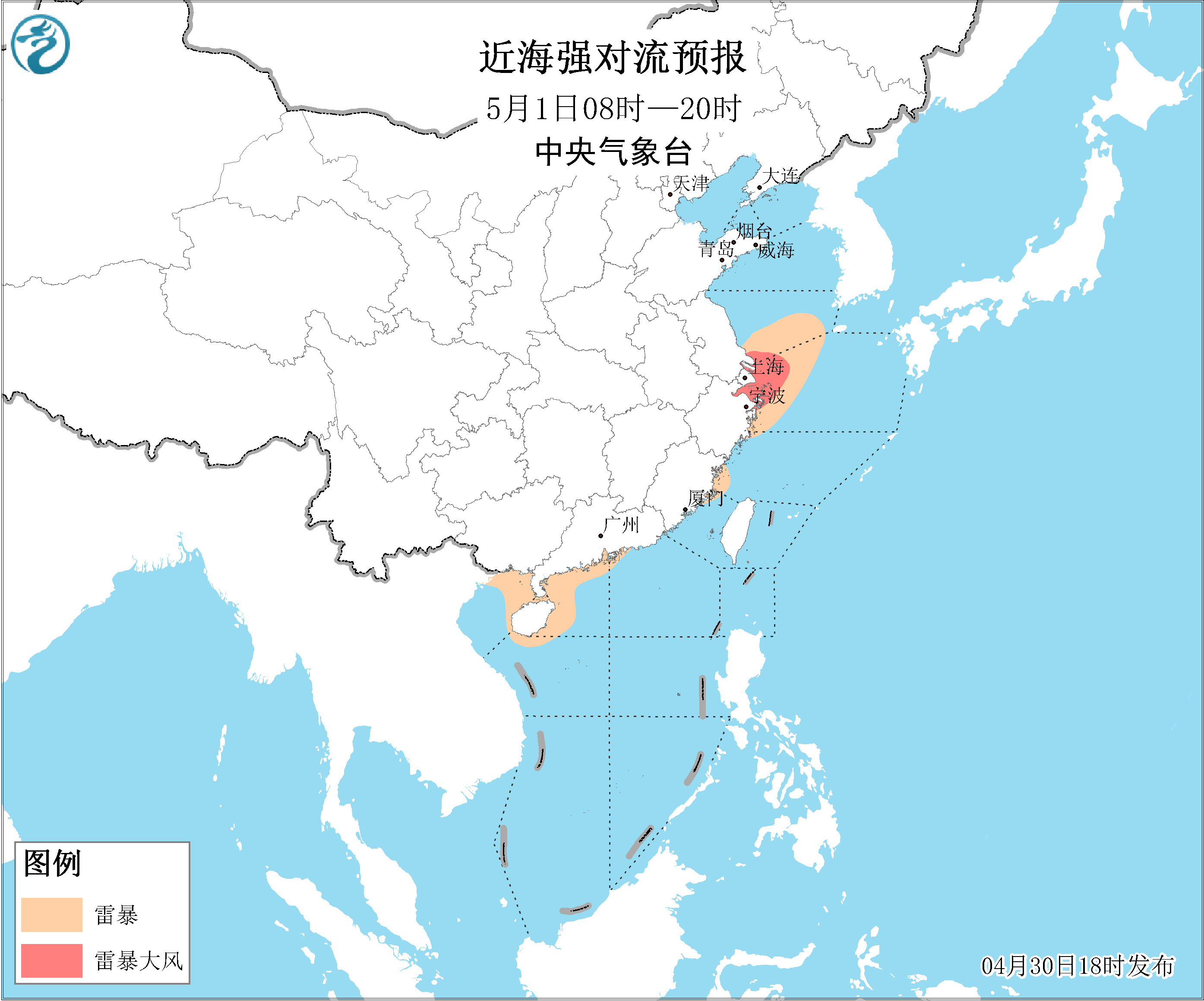 4月30日20時至5月1日20時,黃海北部和中部海域將有5~7級、陣風8級的偏南轉西北風,黃海南部海域將有5~7級、陣風8級的偏南轉偏北風,渤海、渤海海峽將有6~7級、陣風8級的偏西到西北風,東海大部海域將有4~6級、陣風7級的偏南到西南風。渤海海峽、黃海北部海域、遼東半島東部沿岸海域、萊州灣、山東半島北部和東南部沿岸海域、江蘇東部沿岸海域、長江口和杭州灣附近海域、舟山羣島附近海域將有8~10級雷暴大風。