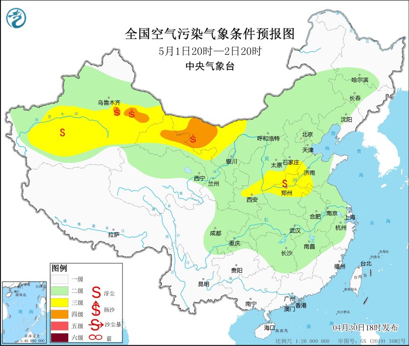 4月30日夜間至5月1日,內蒙古西部、黃淮西部等地的部分地區有揚沙或浮塵天氣。5月2日至3日,新疆東部和南部、內蒙古西部、甘肅河西等地有揚沙或浮塵天氣,局地有沙塵暴。5月4日至5日,內蒙古中西部、西北地區東部、華北西部等地的部分地區自西向東將有沙塵天氣。