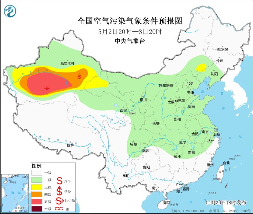 4月30日夜間至5月1日,內蒙古西部等地的部分地區有揚沙或浮塵天氣。5月2日至3日,新疆東部和南部、內蒙古西部、甘肅河西等地的部分地區有揚沙或浮塵天氣,新疆南部部分地區有沙塵暴。5月4日至5日,內蒙古中西部、西北地區東部等地的部分地區自西向東將有沙塵天氣。