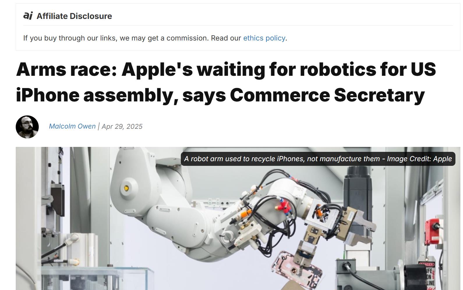 外媒認為,無論蘋果最終是否使用機械臂或人工在美國製造 iPhone,這都需要相當長的時間才能實現。(青雲)