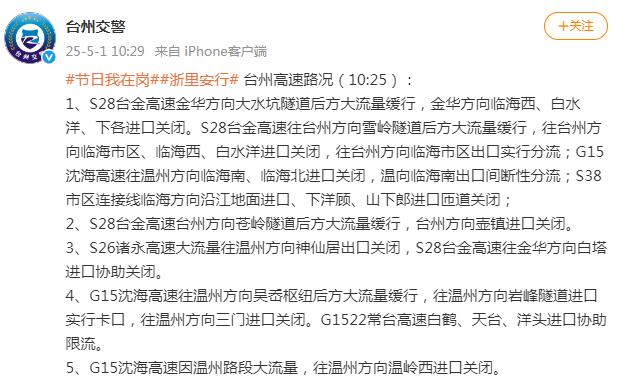1.S28台金高速金華方向大水坑隧道後方大流量緩行,金華方向臨海西、白水洋、下各進口關閉。S28台金高速往台州方向雪嶺隧道後方大流量緩行,往台州方向臨海市區、臨海西、白水洋進口關閉,往台州方向臨海市區出口實行分流;G15瀋海高速往温州方向臨海南、臨海北進口關閉,温向臨海南出口間斷性分流;S38市區連接線臨海方向沿江地面進口、下洋顧、山下郎進口匝道關閉;
