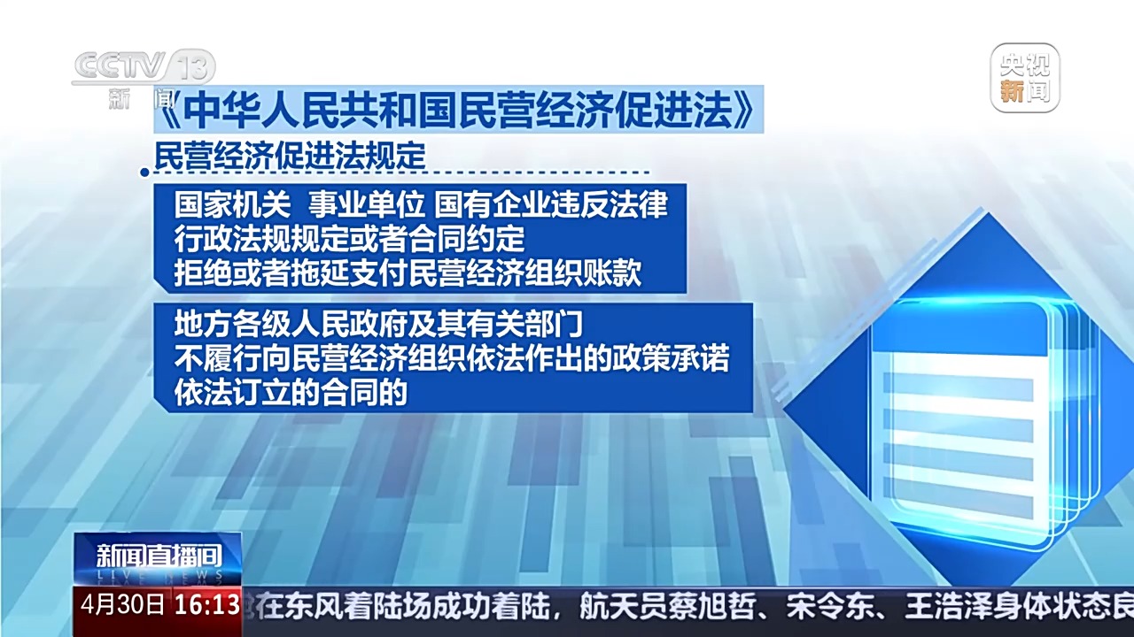 另外,民營經濟促進法規定,國家機關、事業單位、國有企業違反法律、行政法規規定或者合同約定,拒絕或者拖延支付民營經濟組織賬款,地方各級人民政府及其有關部門不履行向民營經濟組織依法作出的政策承諾、依法訂立的合同的,由有權機關予以糾正,造成損失的,依法予以賠償;造成不良後果或者影響的,對負有責任的領導人員和直接責任人員依法給予處分。