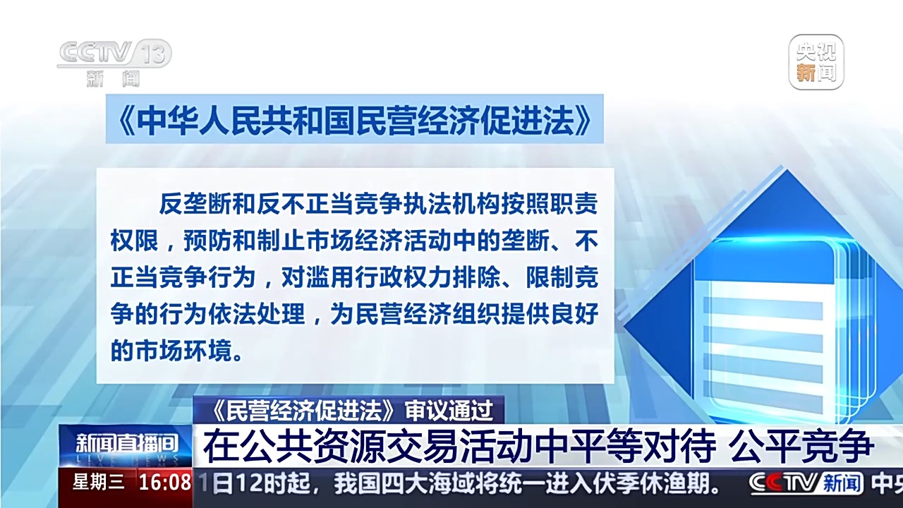 *全國人大常委會法工委經濟法室主任 楊合慶:*規定市場準入負面清單以外的領域,包括民營經濟組織在內的各類經濟組織可以依法平等進入;對落實公平競爭審查制度、定期清理市場準入壁壘、禁止在公共資源交易活動中限制或者排斥民營經濟組織等作出規定。