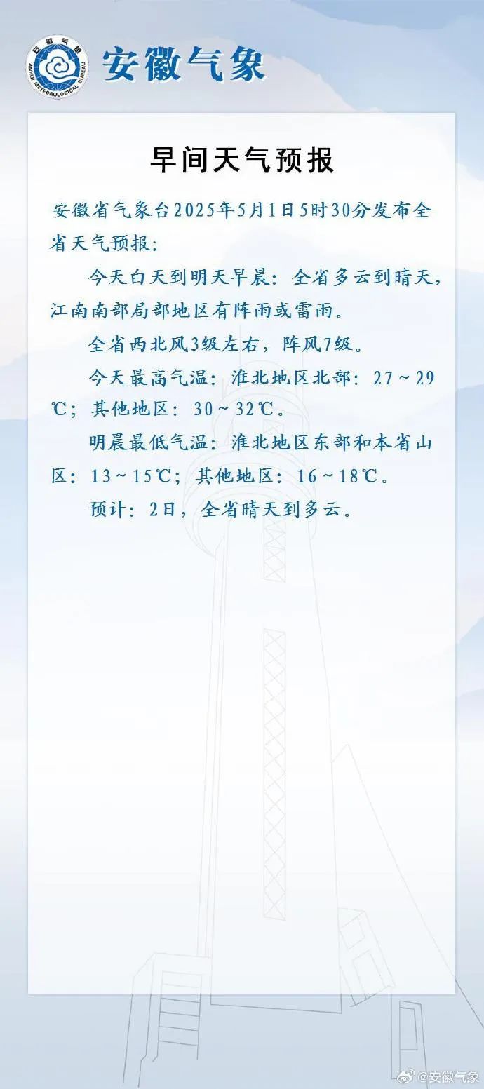 據5月1日早晨安徽省氣象台發佈的全省天氣預報:今天白天到明天早晨:全省多雲到晴天,江南南部局部地區有陣雨或雷雨。全省西北風3級左右,陣風7級。今天最高氣温:淮北地區北部:27~29℃;其他地區:30~32℃。明晨最低氣温:淮北地區東部和本省山區:13~15℃;其他地區:16~18℃。