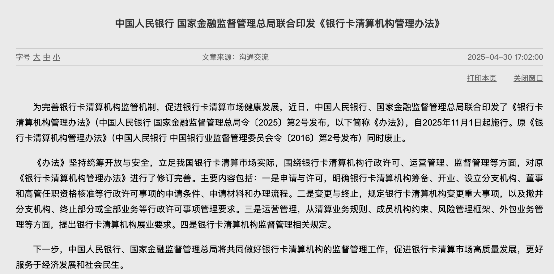 【環球網金融綜合報道】近日,中國人民銀行、國家金融監督管理總局聯合印發了《銀行卡清算機構管理辦法》(中國人民銀行 國家金融監督管理總局令〔2025〕第2號發佈,以下簡稱《辦法》),自2025年11月1日起施行。