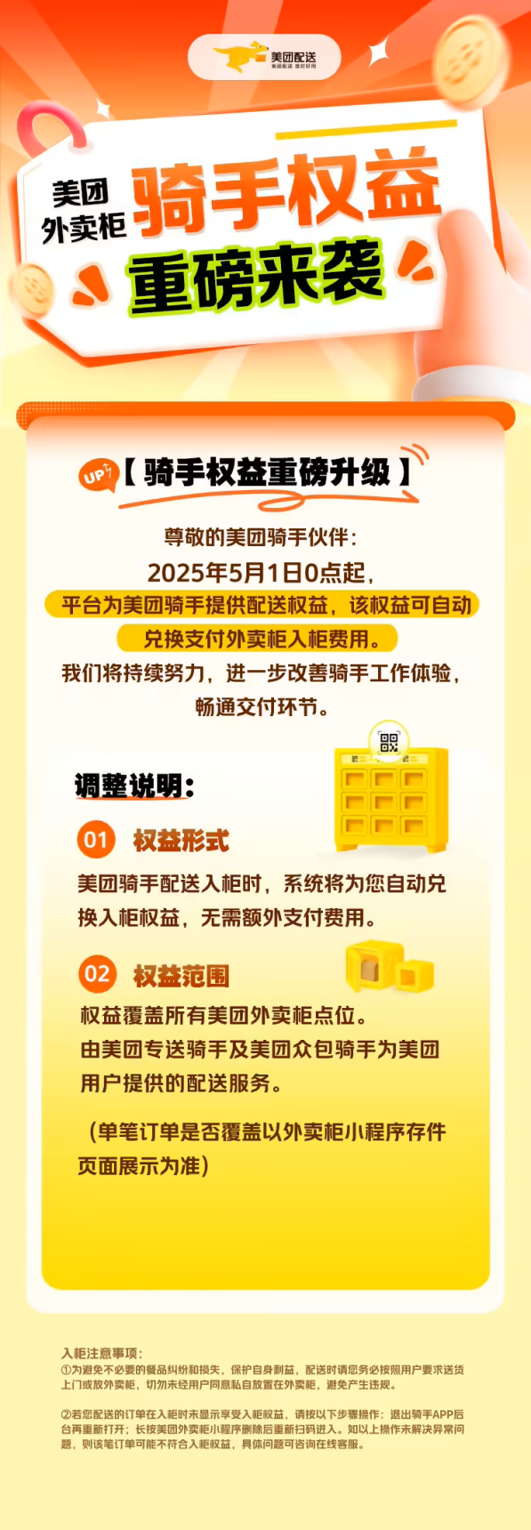 據悉,美團此次推出的配送權益將自動兑換支付外賣櫃入櫃費用,騎手在配送過程中無需額外支付任何費用。該權益覆蓋所有美團外賣櫃點位,無論是美團專送騎手還是美團眾包騎手,在為美團用户提供配送服務時均可享受。
