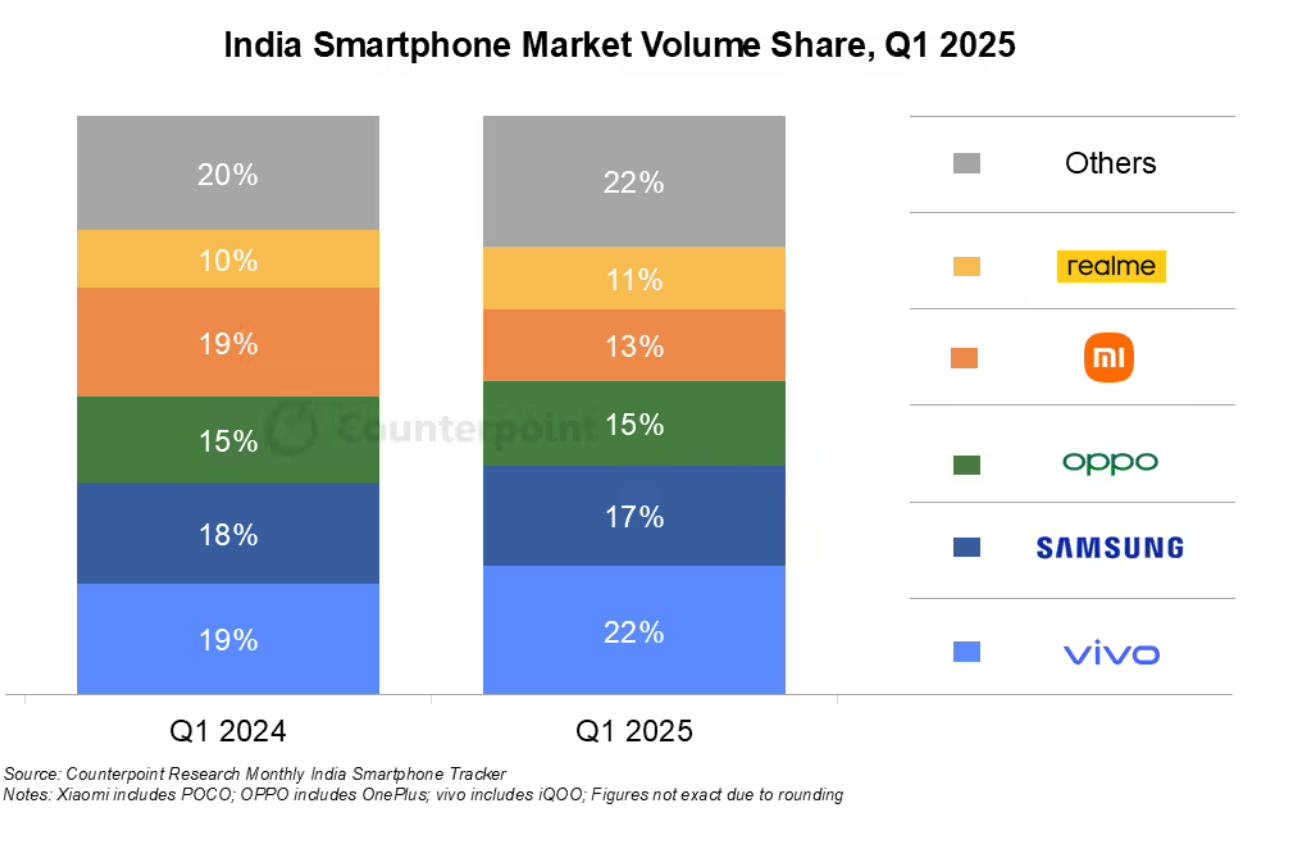 2025印度智能手機市場一季度出貨量,vivo領跑