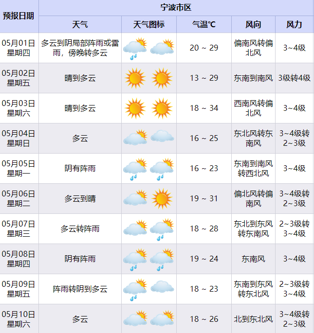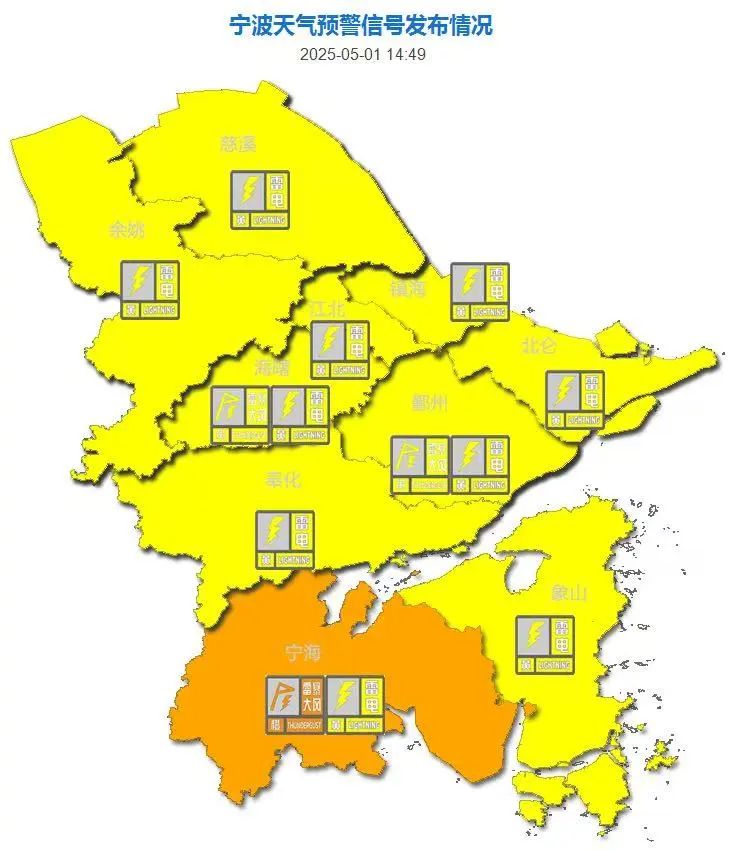 其中,寧波全域發佈雷電黃色預警;海曙區、鄞州區發佈雷暴大風黃色預警;寧海縣發佈雷暴大風橙色預警信號。