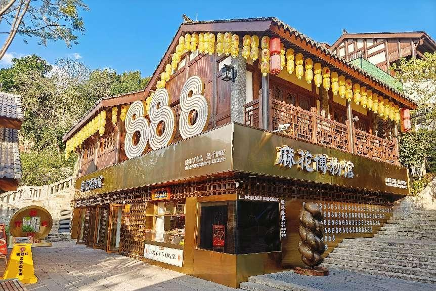 2022年,在磁器口古鎮,百年麻花品牌陳昌銀主動擁抱時代,將非遺轉化為沉浸式體驗經濟:4米高的弧形牆上,榴蓮、巧克力等各種口味的麻花沿牆面延伸至房頂,隨處可見“趣味標語”和“超級符號”;“麻花實驗室”內,遊客可親手體驗揉麪、搓條、油炸等傳統工藝……