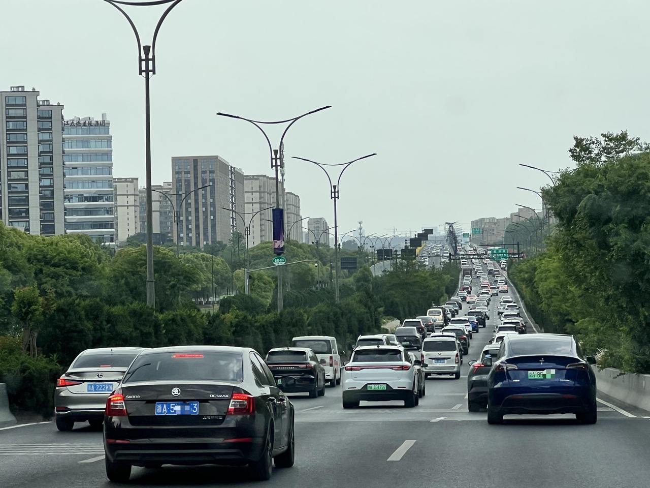“這一帶的高架正好連接着S2杭州高速杭州收費站的出口。”藍先生説,車流中看到各種外地牌照的車牌,省內的有浙B、浙F、浙J,外省牌照有滬A、京A、皖B、魯Q等等:“看來自駕遊杭州的朋友們都到了。”