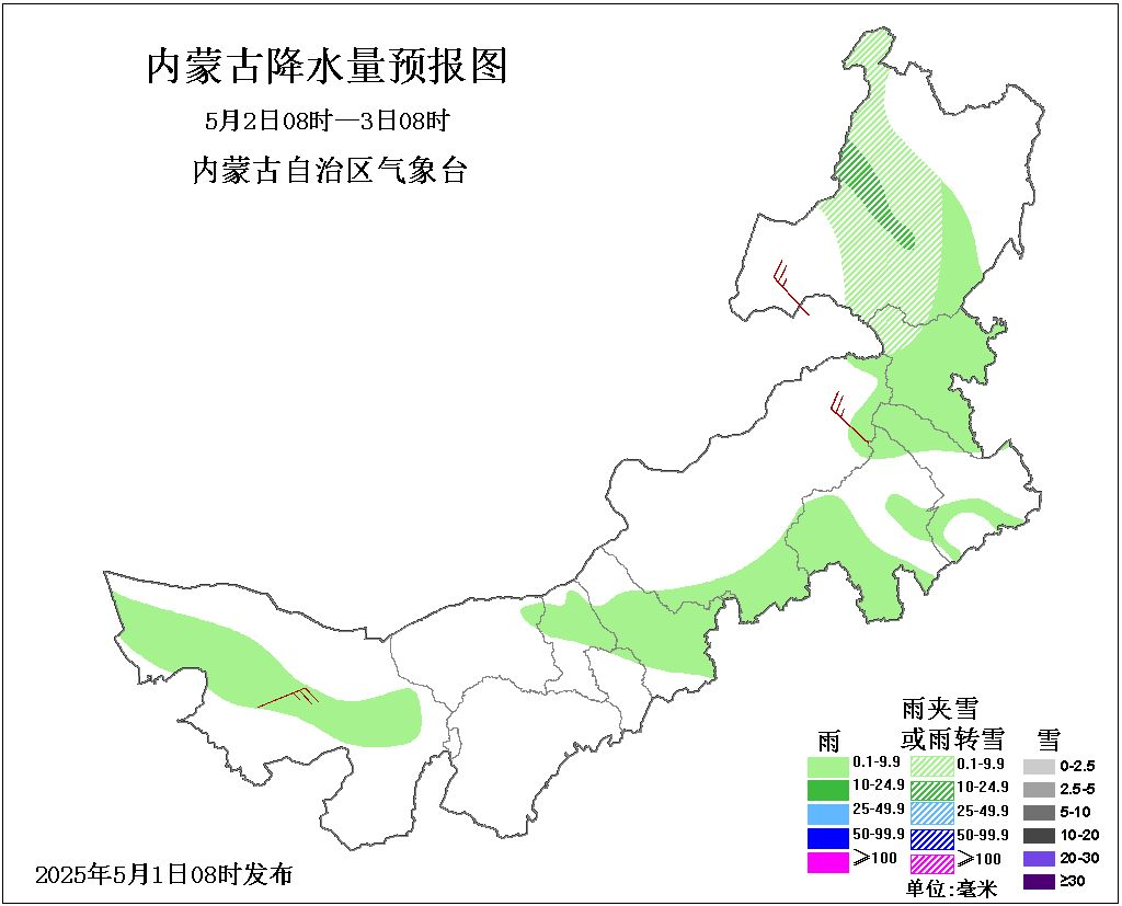 2日08時至3日08時,全區大部地區多雲間晴,阿拉善盟中部、巴彥淖爾市東北部、包頭市北部、烏蘭察布市中部和南部、錫林郭勒盟南部和東北部、赤峯市西部和北部偏北、通遼市西北部和南部部分地區、興安盟、呼倫貝爾市中部有小雨或雨夾雪;全區大部地區4、5級短時6、7級局地8、9級東北風或西北風;西部、中部偏西和東北部地區氣温下降4到6℃,西部偏南地區氣温下降6到8℃,局部地區氣温下降10℃以上。