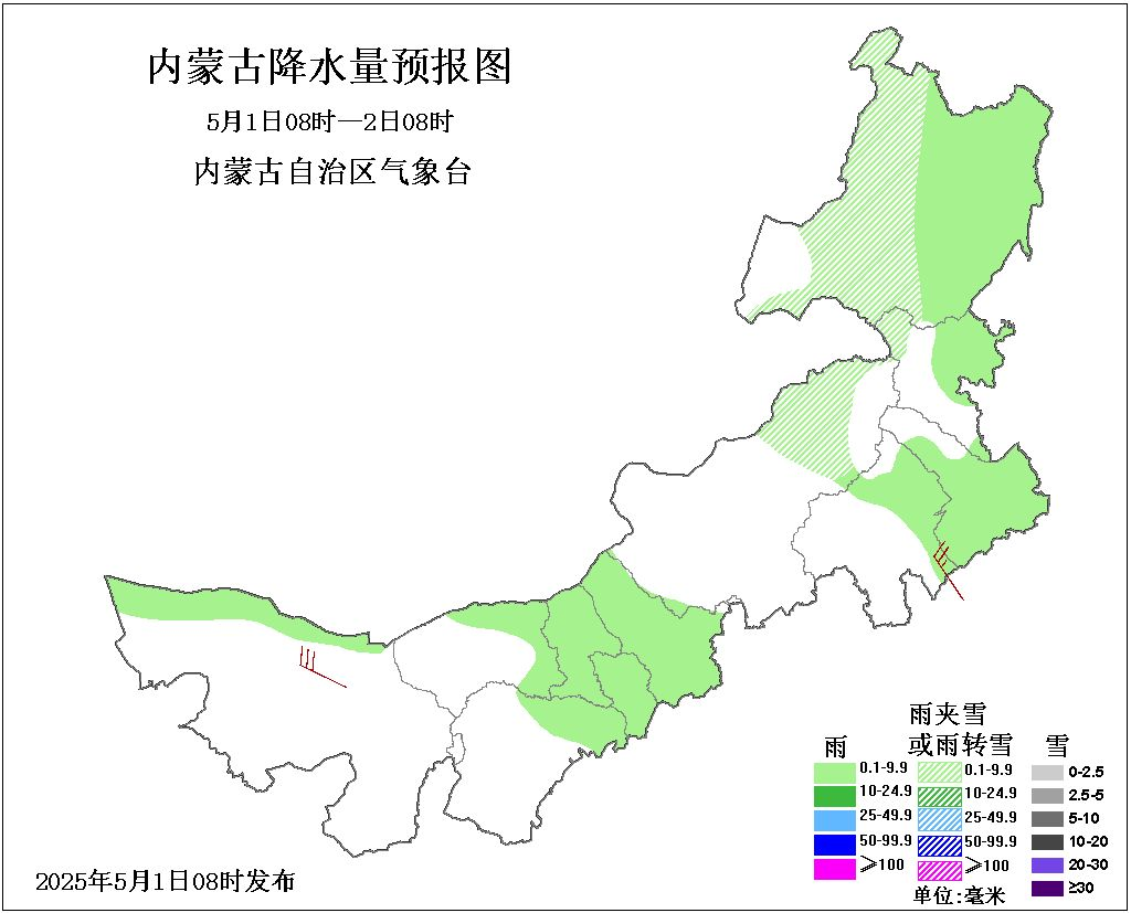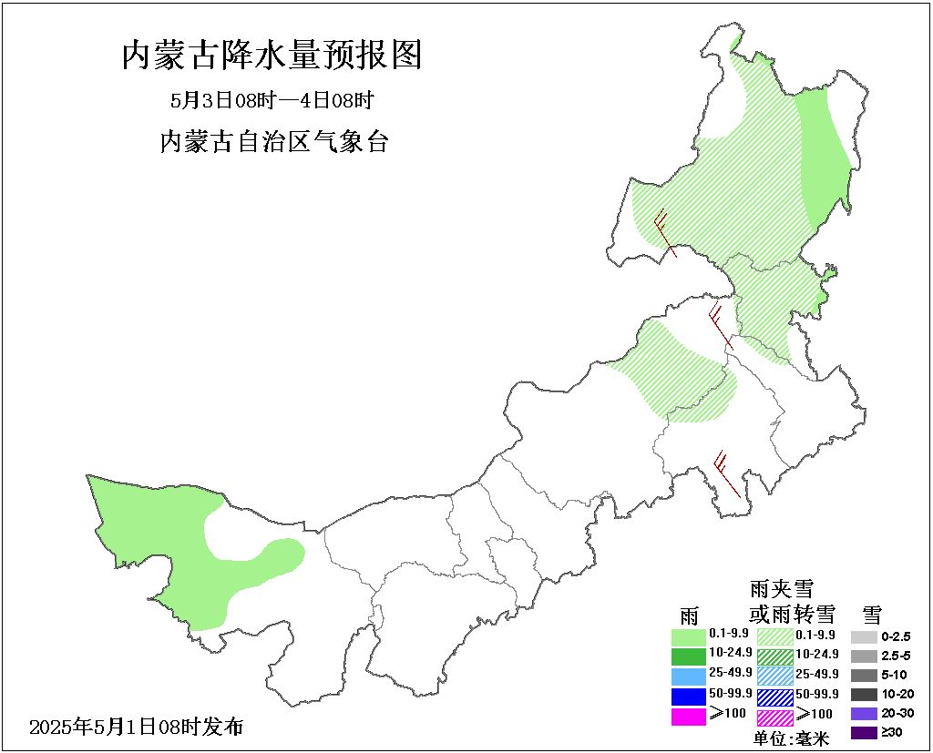 3日08時至4日08時,西部偏西、中部偏東和東部大部地區多雲間晴,阿拉善盟西部、錫林郭勒盟東部、赤峯市北部、興安盟大部、呼倫貝爾市大部有小雨或雨夾雪,其餘地區晴間多雲;中部大部、東南部和東北部偏西地區4、5級短時6、7級局地8、9級西北風。