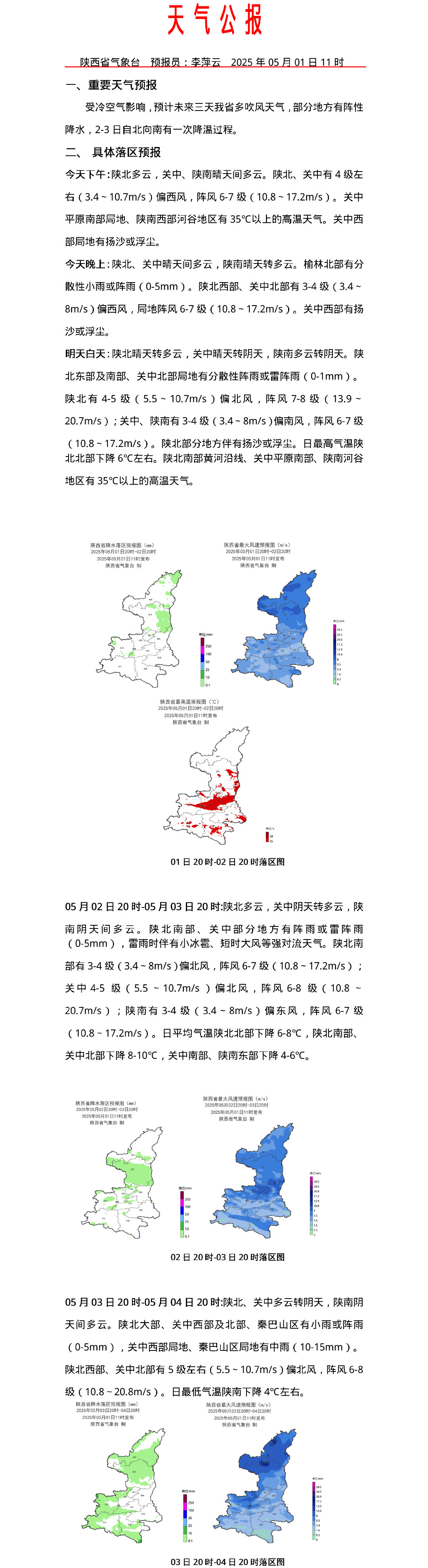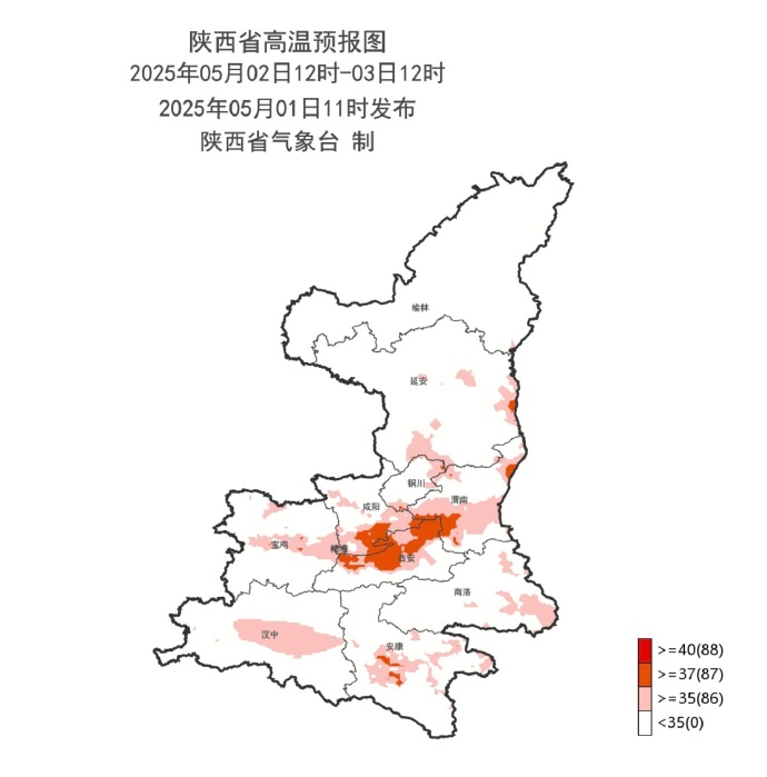 受高空西北氣流影響,預計05月01日西安北部、寶雞中部、咸陽南部局地、渭南西部局地、楊凌、漢中河谷地區,安康西部河谷地區有35℃以上的高温天氣。05月02日西安大部、寶雞中部、咸陽南部、楊凌、渭南部分、銅川東部局地、延安黃河沿線及南部局地、漢中河谷地區、安康河谷地區、商洛南部有35~37℃的高温天氣,局地可達37℃以上。