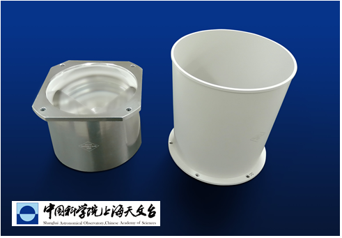 △中國科學院上海天文台研製的新一代地月空間激光角反射器:角反射器本體(左)和遮光筒(右)