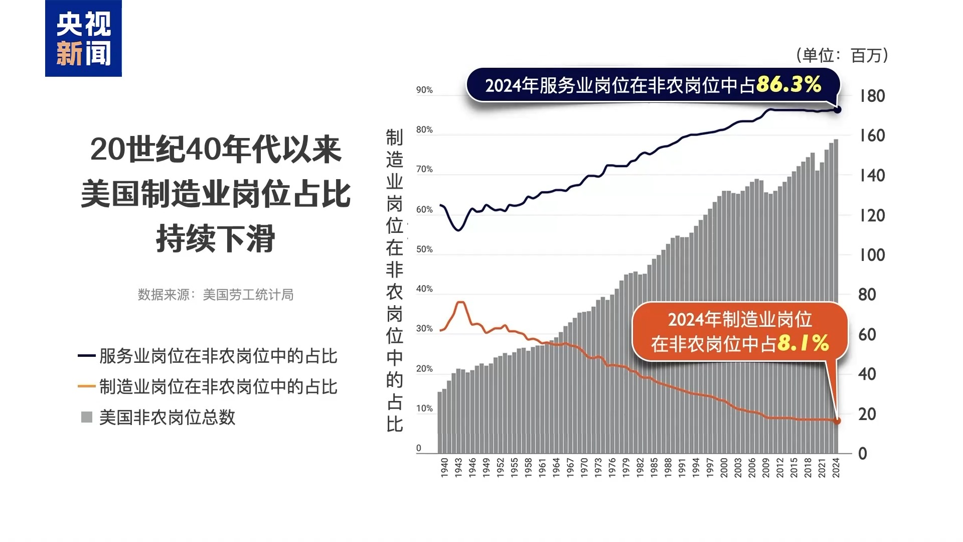 對此,彭博社一針見血地指出,“這是美國製造業殘酷現實的縮影”,儘管美國政府一再宣稱要“復興美國製造”,但實際就業增長幅度不大,企業外流、基礎設施不足等問題久拖未決,白宮鼓吹的“關税魔力”恐難逆轉美國數十年來的產業外遷趨勢。
