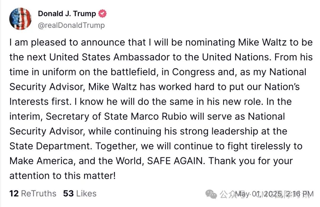 當地時間5月1日下午,北京時間今天(5月2日)凌晨,美國總統特朗普在其社交平台“真實社交”上發文,宣佈提名總統國家安全事務助理邁克·華爾茲為下一任美國常駐聯合國代表。