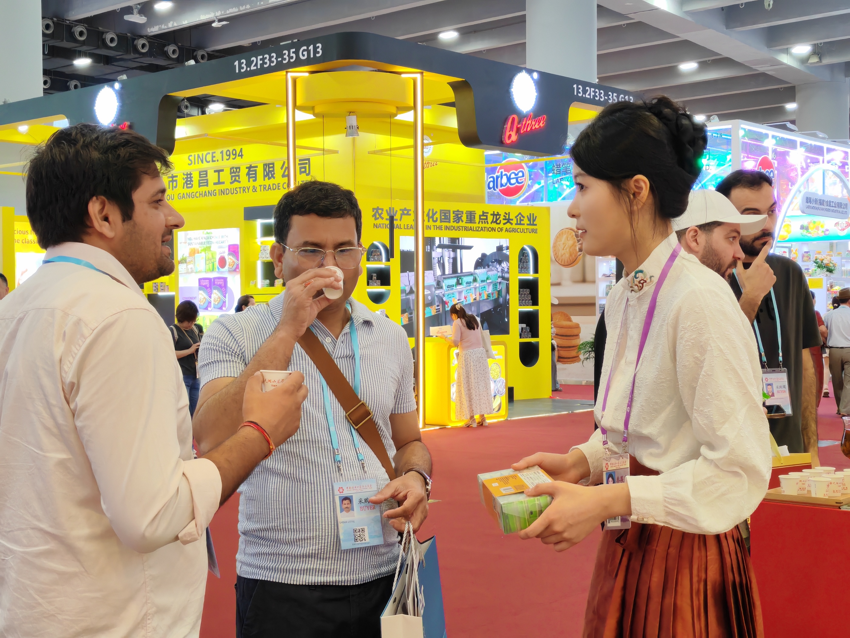 走進最熱鬧的食品展區,國內參展商與馬來西亞、泰國、俄羅斯、土耳其等海外參展商紛紛掏出看家產品,現場展示廚藝,邀請參展客商品嚐。“我們從2016年就開始參加廣交會,廣交會豐富的多國客源幫我們拓展了很多銷售渠道,第一次銷往非洲就是在這裏實現的。”一家馬來西亞食品公司的工作人員介紹。
