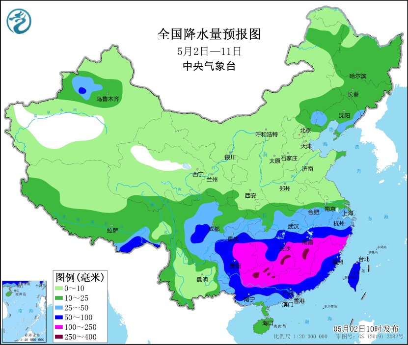 未來10天(5月2日-11日),江南中南部、華南中北部及貴州等地累計降水量有40~80毫米,其中江南南部、華南北部的部分地區有100~200毫米,局地超過250毫米;上述地區累計降水量較常年同期偏多2~6成,局地偏多1倍以上,我國其餘大部地區降水偏少。