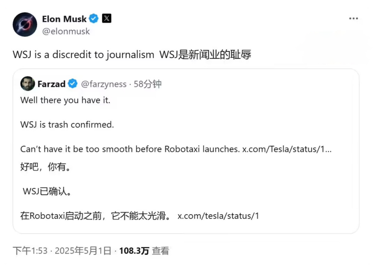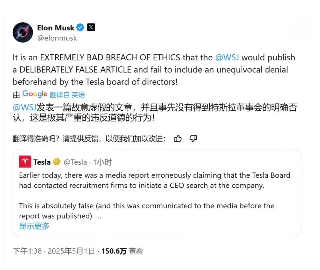 馬斯克週四在 X 上發文稱,“ @WSJ故意發表虛假文章,並且沒有事先得到特斯拉董事會的明確否認, 這是極其嚴重的違反道德的行為!”