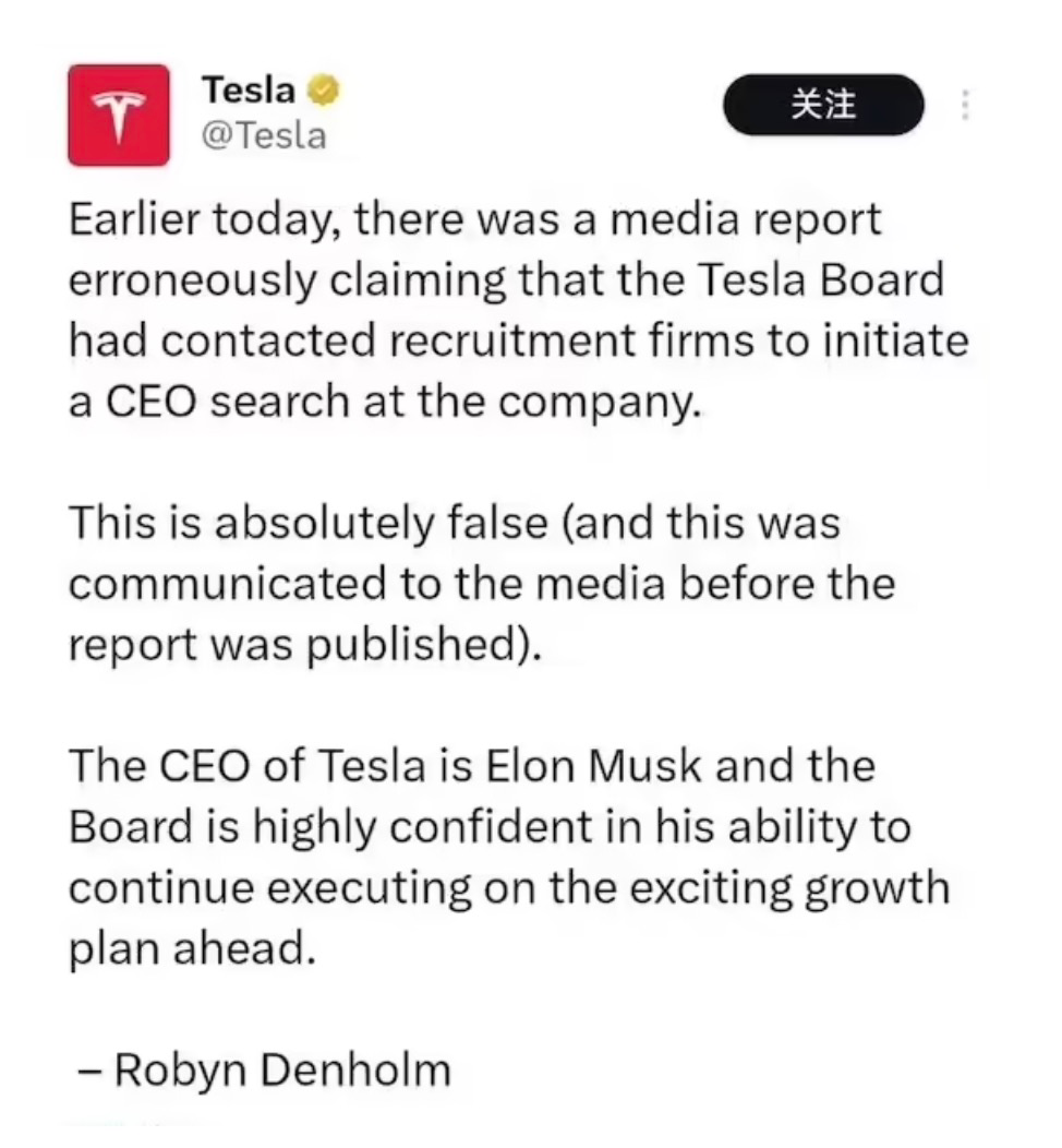 丹霍姆在特斯拉官方 X賬户上發帖稱,這一説法“完全是錯誤的”,董事會“對他繼續執行未來令人興奮的增長計劃的能力非常有信心”。
