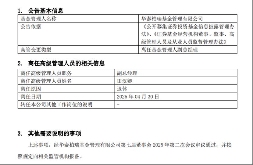 【環球網金融綜合報道】5月1日,華泰柏瑞基金髮布公告稱,田漢卿卸任公司副總經理一職,原因為退休,離任時間為4月30日。而4月29日,該公司宣佈,田漢卿卸任華泰柏瑞中證500指數增強、華泰柏瑞量化先行混合、華泰柏瑞量化創優等10只基金的基金經理。