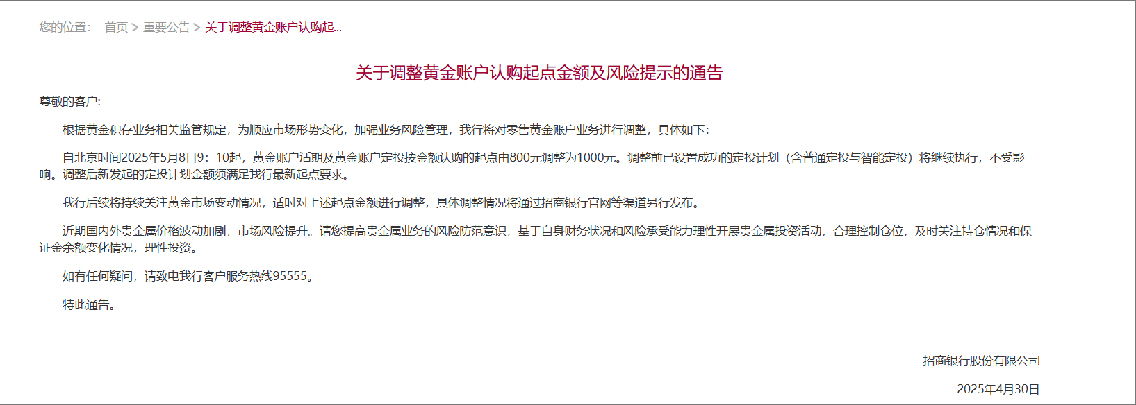 2月14日,招商銀行公告稱,自2月24日起,黃金賬户活期買入起點及黃金賬户定投起點由1克/650元起調整為1克/700元起;3月21日,招商銀行再度公告,自3月27日起,黃金賬户活期買入起點及黃金賬户定投起點由1克/700元起調整為1克/750元起;4月15日,招商銀行發佈貴金屬業務調整通告,自4月21日起,黃金賬户活期及黃金賬户定投按金額認購的起點由750元調整為800元。