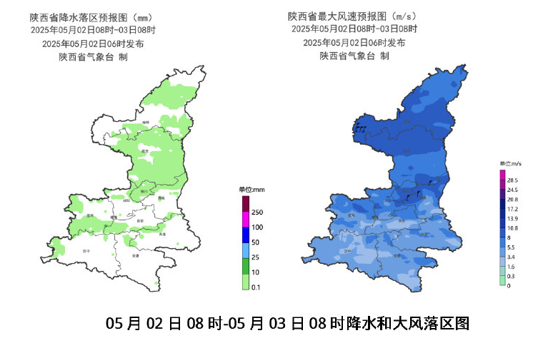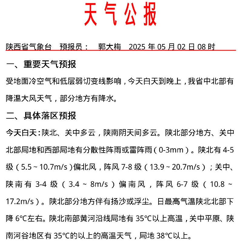 受槽後西北氣流和地面冷鋒共同影響,預計5月2日13時至2日22時,陝北南部、關中部分、秦巴山區有雷暴天氣,其中延安南部局地、銅川、渭南北部局地、寶雞西部、西安北部局地及秦嶺山區局地有雷暴大風(陣風8級以上)或冰雹。過程期間伴有分散性陣雨或雷陣雨(0.1到10毫米),個別點小時雨量可達10毫米以上。此次過程受系統性大風和對流性大風共同影響,大風範圍廣,局地風力強,並伴有雷電。