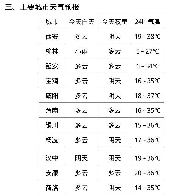 預計新城區、碑林區、蓮湖區、雁塔區、灞橋區、未央區、閻良區、臨潼區、長安區、高陵區、鄠邑區、周至縣、藍田縣、西鹹新區*未來24小時內最高氣温將升至37℃以上,*請注意防範。
