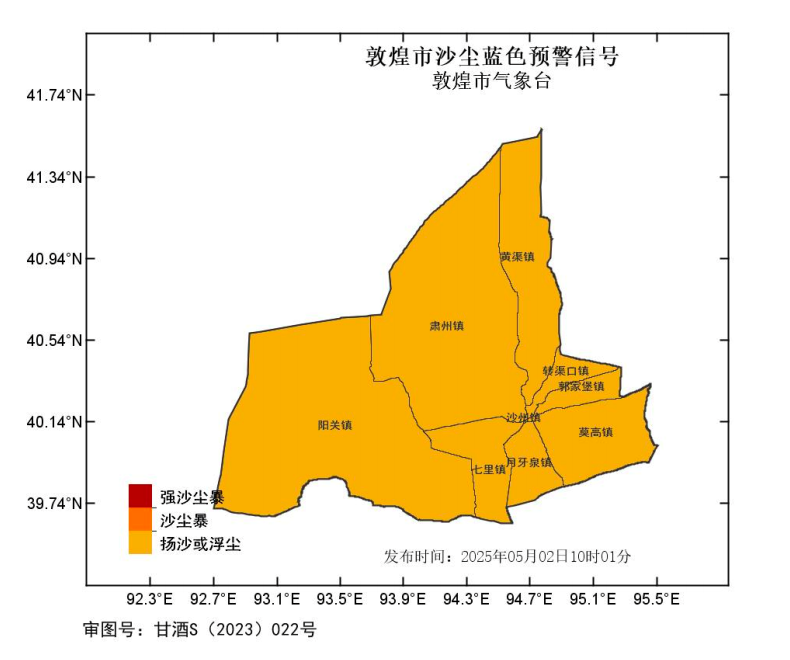 5月2日,甘肅省氣象局、甘肅省交通運輸廳、甘肅省公安廳交通管理總隊聯合發佈《甘肅省公路大風沙塵氣象災害風險預警》提示: