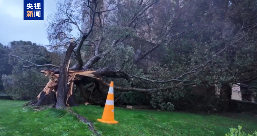 *總枱記者 劉志敏:*我現在所在的位置是新西蘭首都惠靈頓城區。大家可以看到我身後的這棵大樹已經被強風吹倒,粗大的樹幹從基部斷裂,斷面參差不齊,它現在正平躺在前方的綠地上,不遠處就是城市建築物。受此次強風、強降雨天氣影響,惠靈頓地區多棵樹木被吹倒,市政部門已封鎖了相關現場。
