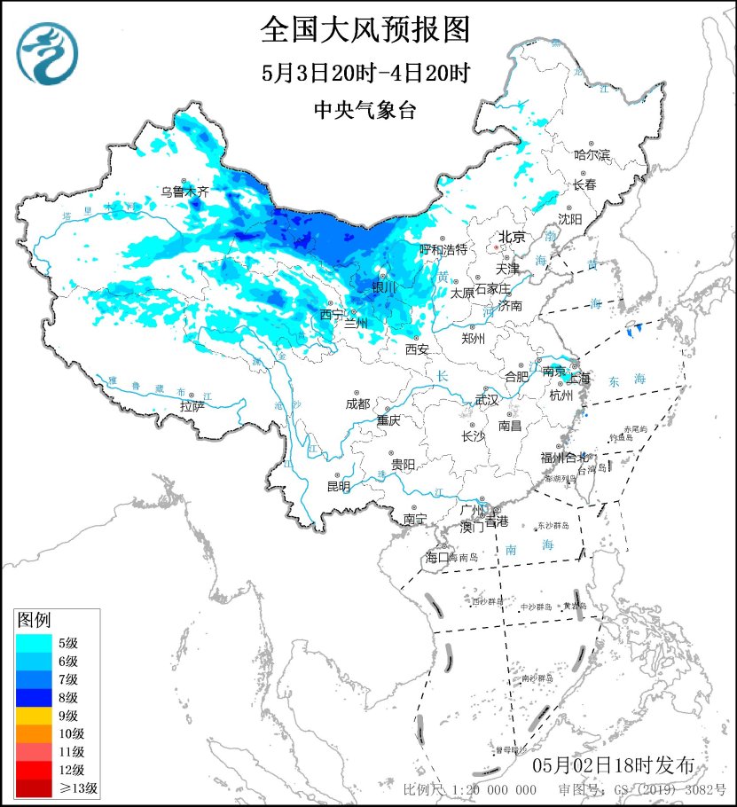 *中央氣象台5月2日18時發佈大風藍色預警:*預計,5月2日20時至3日20時,新疆大部、內蒙古中東部、甘肅河西北部、青海西北部、遼寧西部、河北東南部和北部、山東西部、河南中東部等地有5~6級、陣風7~8級的大風,其中,新疆北部和南疆盆地東部有7~8級、陣風9~11級的大風,山口地區風力可達12級以上;黃海中南部、東海北部等部分海域有7級、陣風8級的大風(見圖1)。