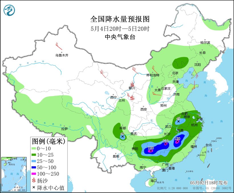 *5月3日20時至4日20時,*江漢東部、湖南西部、江南中南部、西南地區東南部、華南北部等地部分地區有中到大雨,其中,江西南部、福建東南部和西北部、貴州東南部、廣西東北部、廣東西北部等地部分地區有暴雨或大暴雨(100~130毫米)。新疆東部、內蒙古中西部、青海大部、甘肅大部、寧夏、陝西北部等地有5~7級、陣風8~10級、局地11級的大風(見圖4)。