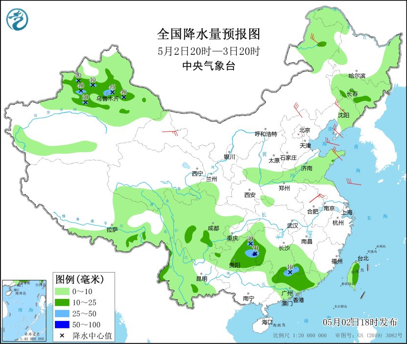 *5月2日20時至3日20時,*新疆沿天山地區和伊犁河谷、重慶東南部、貴州中東部、湖南西部和南部、廣東中東部等地部分地區有中到大雨,其中,湖南西部、貴州東部等地局地有暴雨(50~70毫米)。新疆大部、內蒙古中東部、甘肅河西北部、青海西北部、遼寧西部、河北東南部和北部、山東西部、河南中東部等地有5~6級、陣風7~8級的大風,其中,新疆北部和南疆盆地東部有7~8級、陣風9~11級的大風,山口地區風力可達12級以上;黃海中南部、東海北部等部分海域有7級、陣風8級的大風(見圖3)。