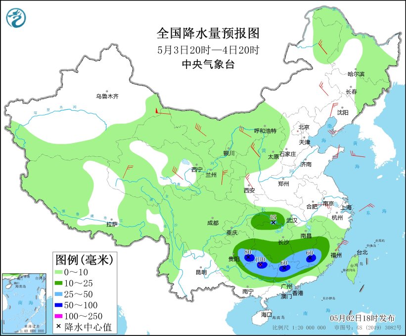 5月3日至5日,西南地區東部、江南、華南等地部分地區將有中到大雨,局地暴雨或大暴雨,並伴有短時強降水、雷暴大風等強對流天氣。