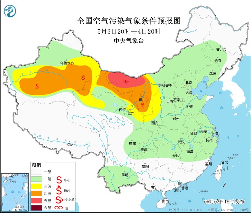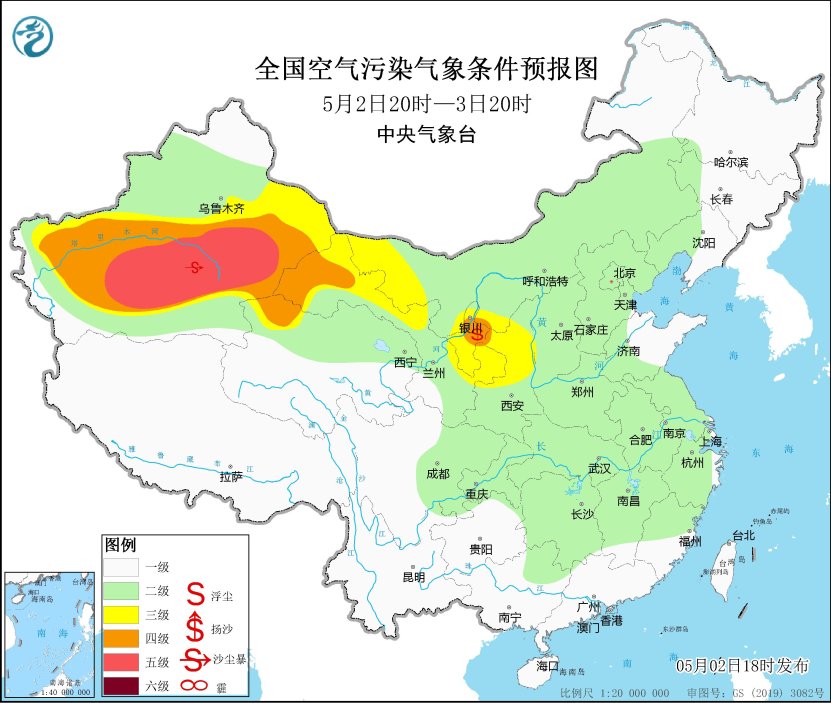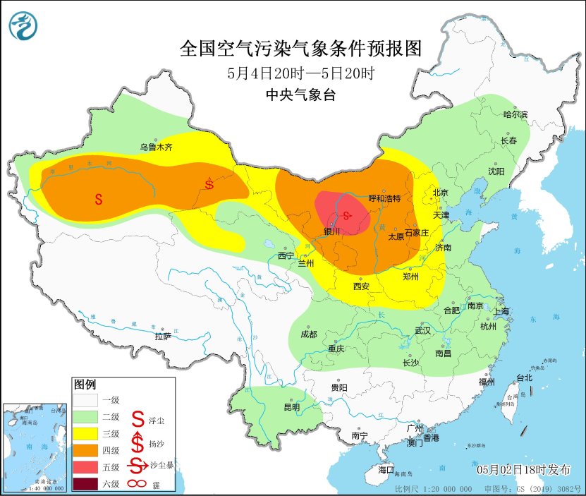 3日,新疆東部和南部、內蒙古西部、甘肅西部、寧夏等地的部分地區有揚沙或浮塵天氣,新疆南部的部分地區有沙塵暴。4日至5日,新疆東部和南部、內蒙古中西部、西北地區東部、華北、黃淮、江淮、四川盆地北部等地的部分地區有揚沙或浮塵天氣,其中,內蒙古西部、甘肅西部、寧夏等地的部分地區有沙塵暴。