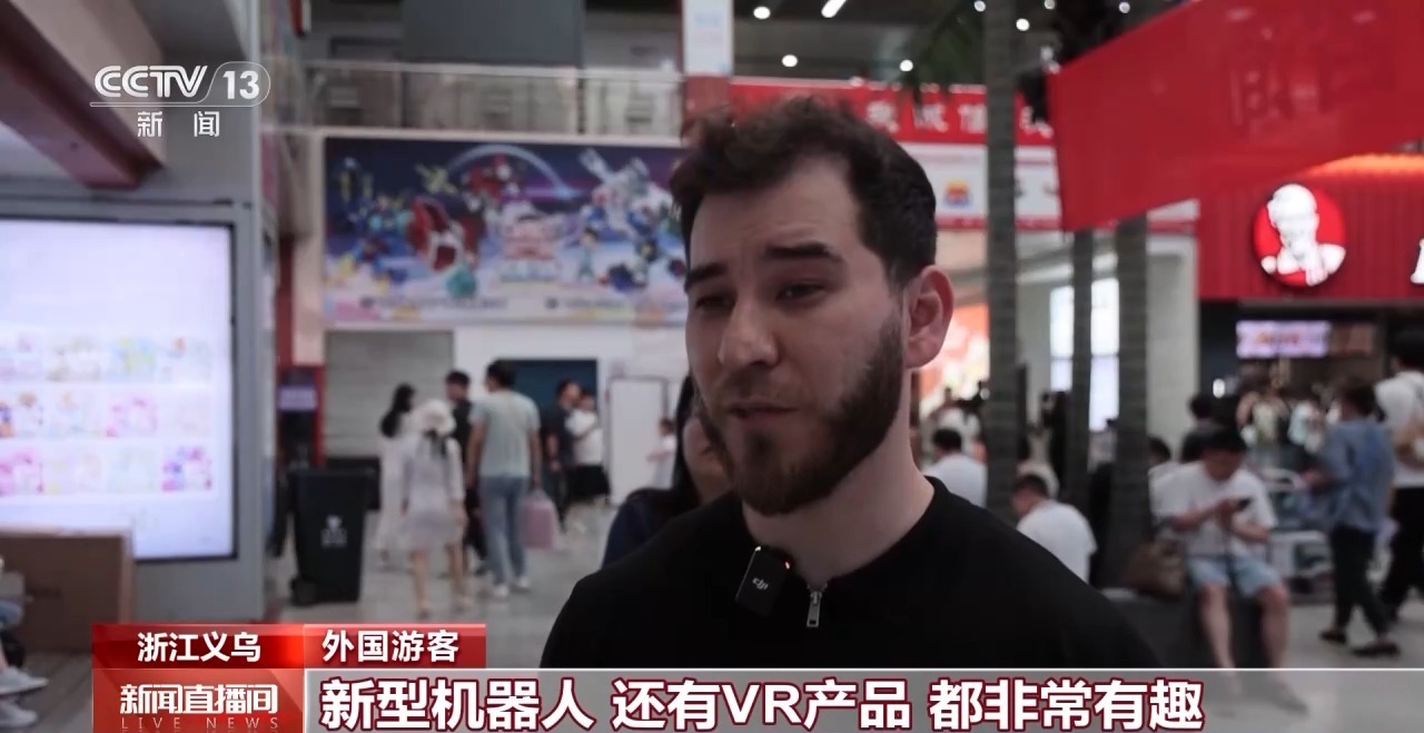 *外國遊客:*我的朋友們是第一次來義烏,他們都很喜歡義烏,因為這裏的產品都很有意思,吃住也都很舒適。我們剛剛在體驗AR產品、新型機器人、VR產品,都非常有趣。