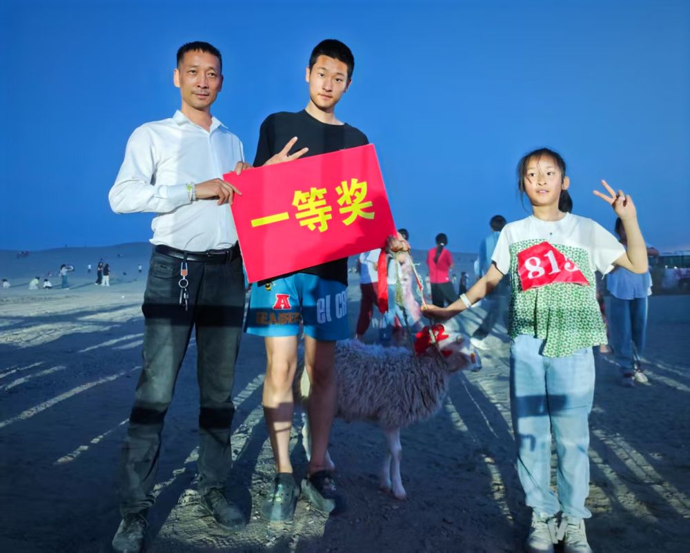 這是5月1日洛浦縣玉龍灣沙漠樂園“大手拉小手”親子徒步比賽家庭組一等獎獲得者哥哥李一銘與妹妹李鈺瑩在領取獎品一隻羊後與父親的合照。